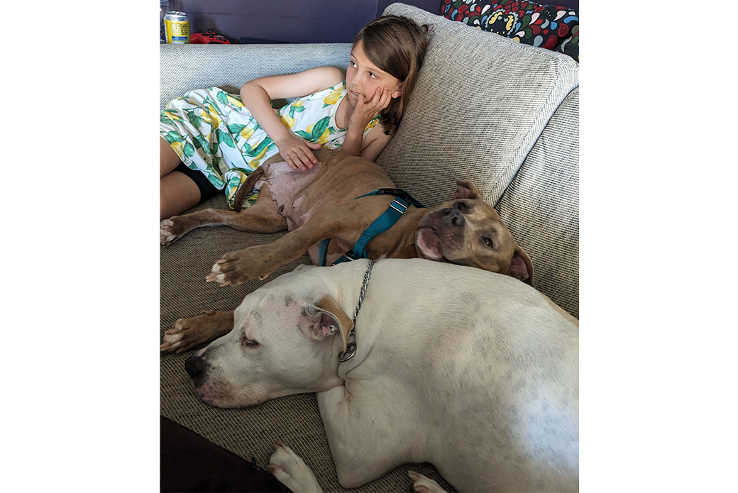“After our 14-year-old pit bull, Monty, died in May, our remaining dog, Petey, was so sad and dejected,” says Nick Stefanik, a project manager for the Columbus Downtown Development Corporation. “I looked online for pit bulls in our area, and Dumplin was one of the first I saw. Her description said she’s laid back and a couch potato who loves to cuddle and that’s exactly what we were looking for—a second dog for Petey to cuddle with.”