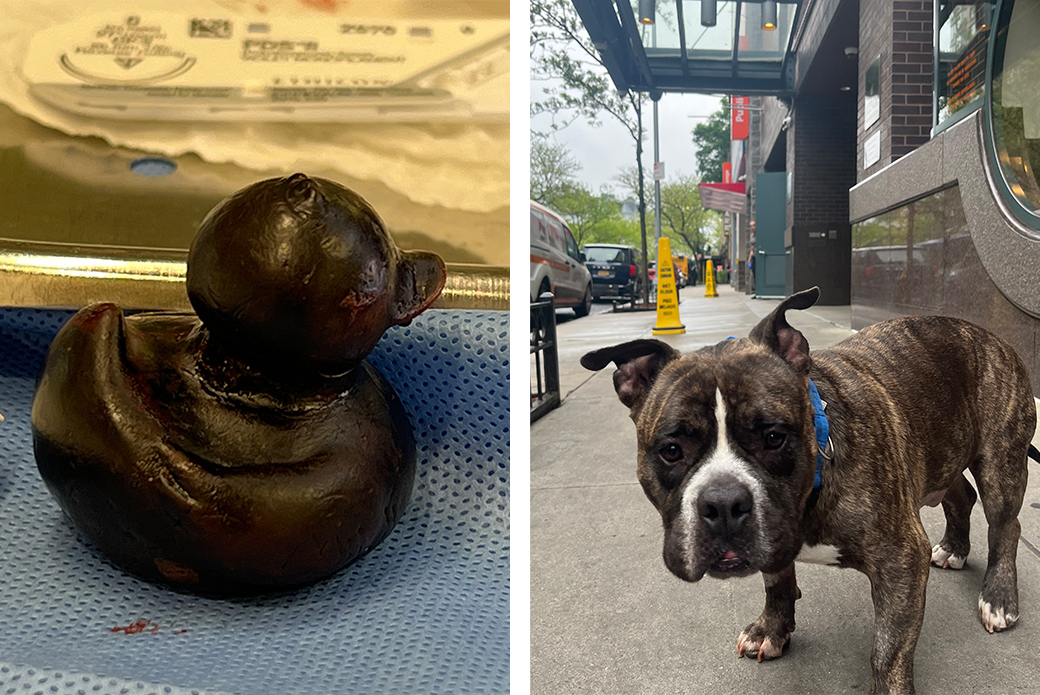 Apo immediately went into surgery, where Dr. Julie DiMeglio and Carol Algarin, a Licensed Veterinary Technician, found the rubber duck stuck in Apo’s duodenum—small intestine—just past his stomach. Dr. DiMeglio cut into a healthy part of the duodenum where the toy hadn't yet reached and pushed it out through the opening. Then she closed the hole.