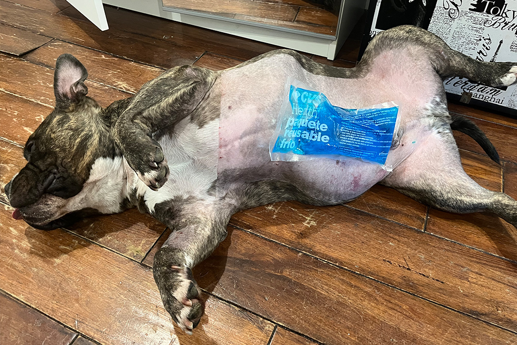Following veterinary instructions, Oscar and Claudia provided a cold compress to Apo’s incision for several days, and he was able to walk again two days after surgery.