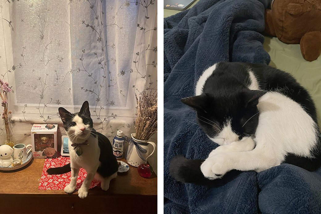 “It’s not the best photo, but you can see how Oslo had a funny habit of trying to dive headfirst into your lap as soon as you open his cage,” she says. “He is a very affectionate cat.”